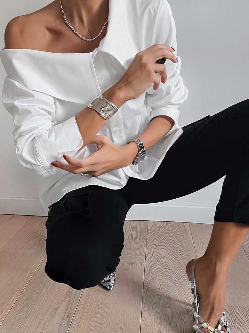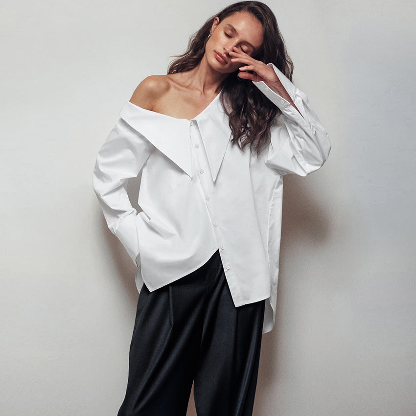 Elevate your style with our White Irregular Neck Sexy Off-the-shoulder Blouse. Featuring a unique irregular neckline and a trendy off-the-shoulder design, this blouse is perfect for adding a touch of sexiness to any outfit. With its crisp white color, it's versatile and sure to turn heads.